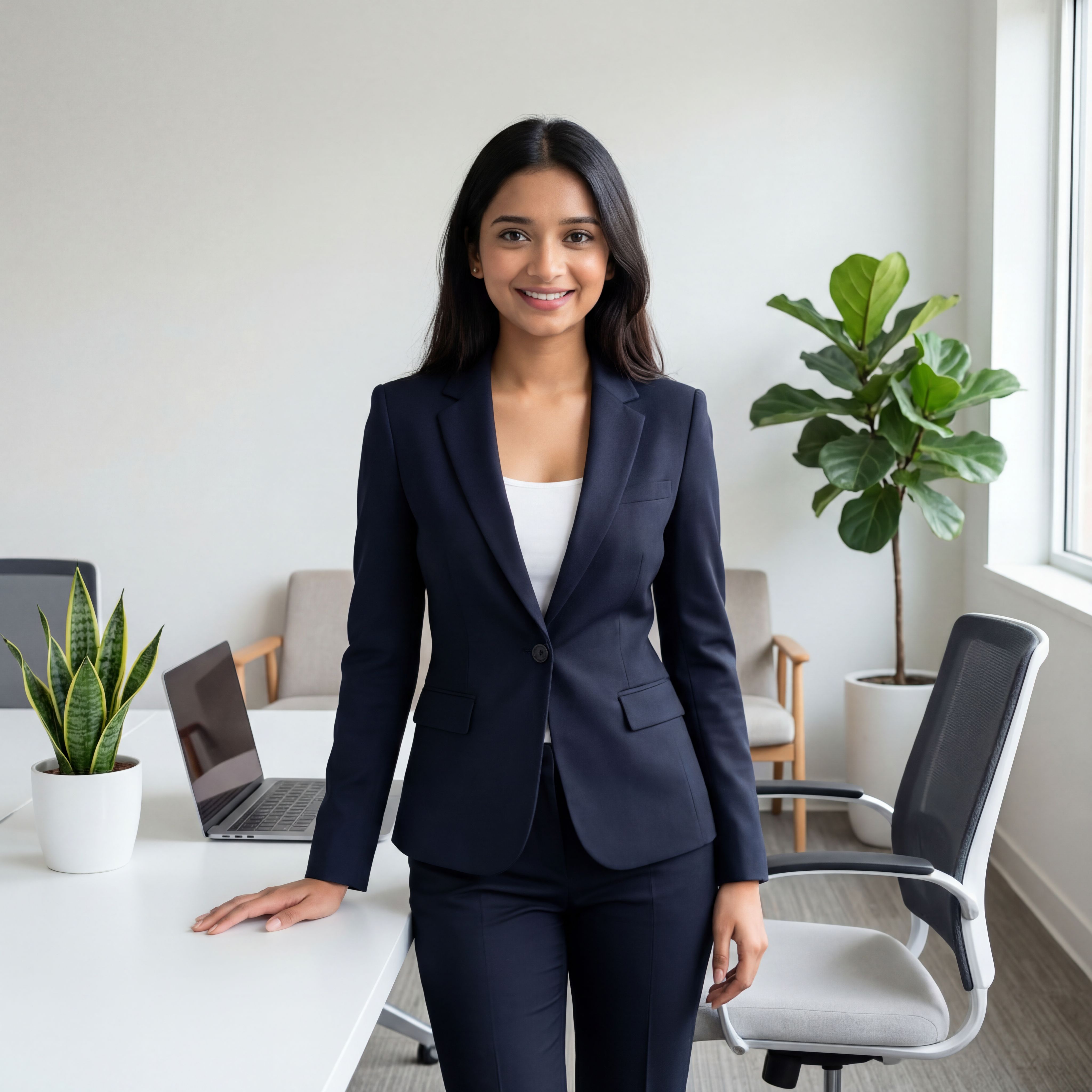 Tailored black blazer over white blouse with a confident smile. This LinkedIn-friendly style projects approachability and professionalism—perfect for client-facing roles, consultants, and executives who want to appear welcoming.